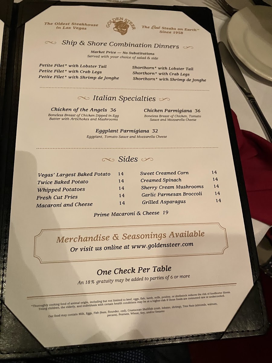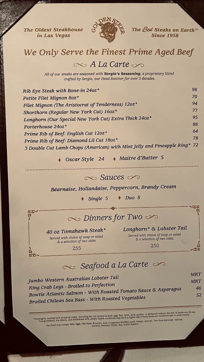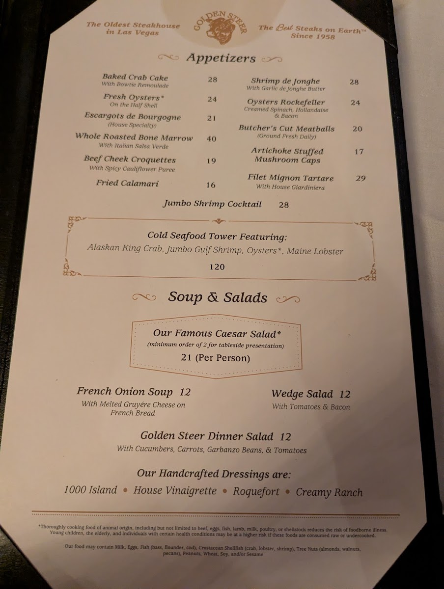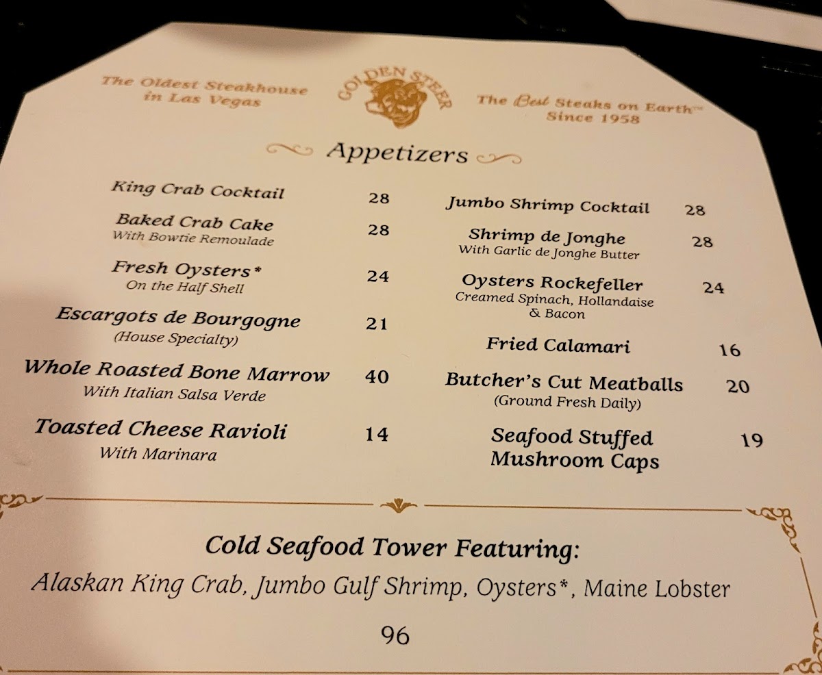 Golden Steer Steakhouse Las Vegas Menu