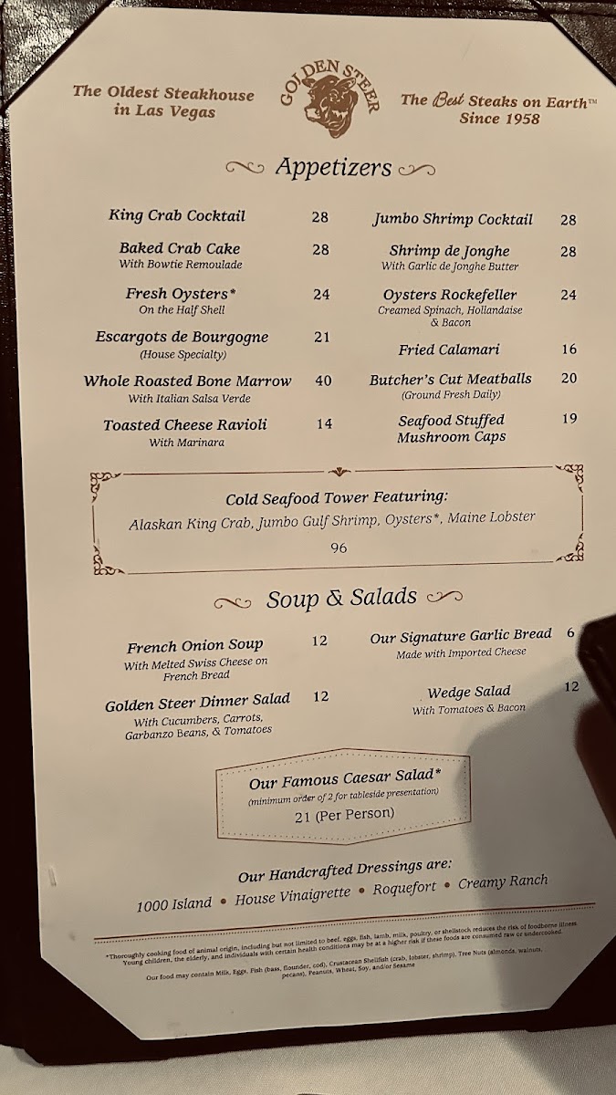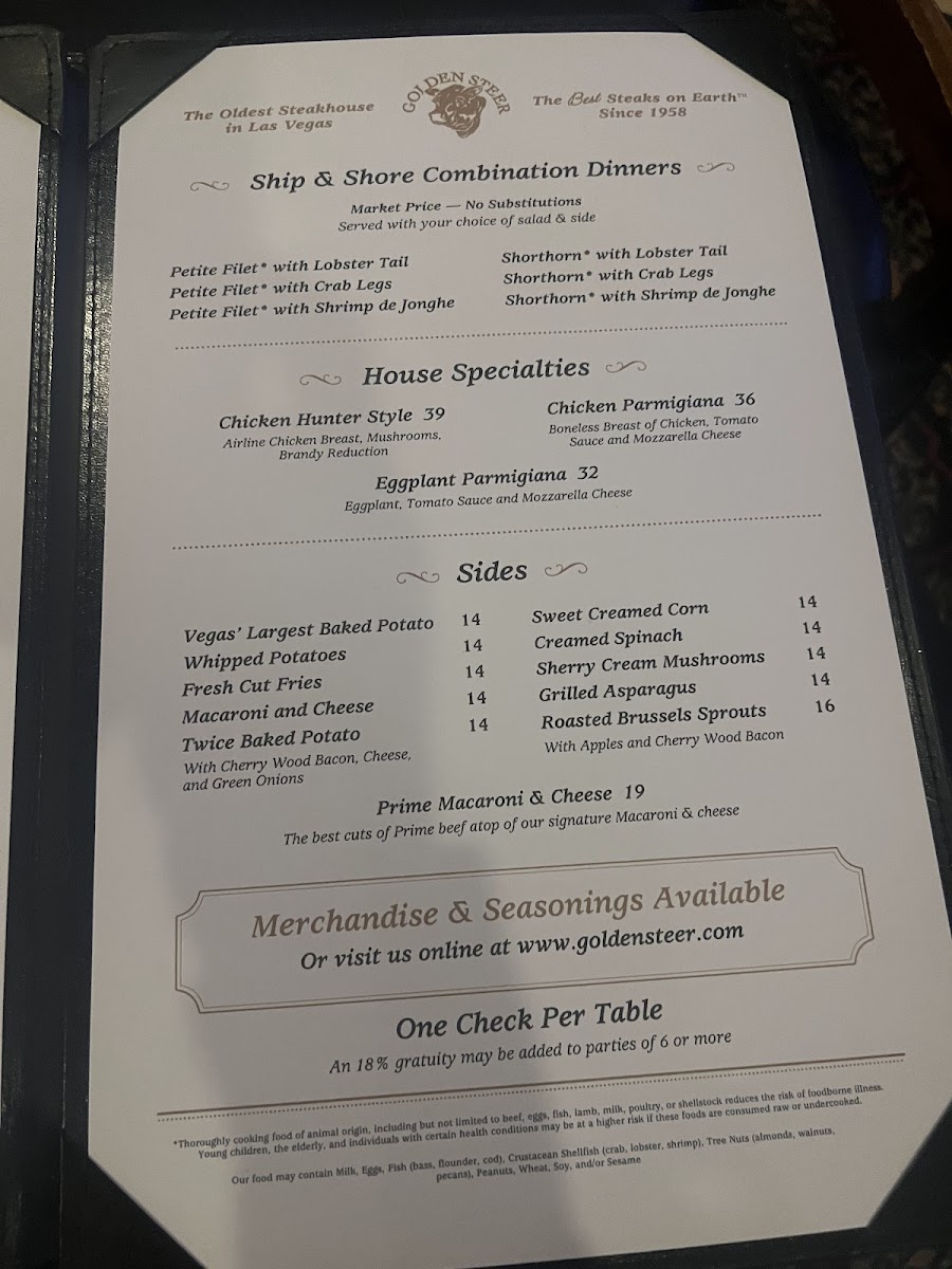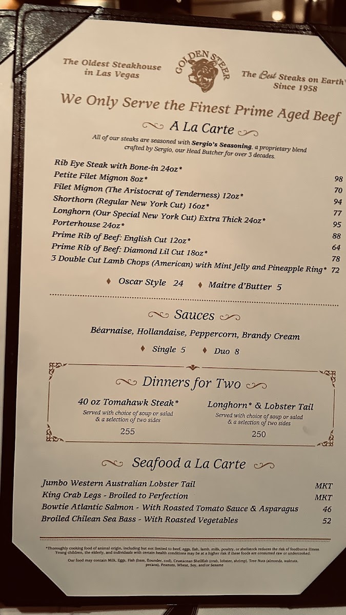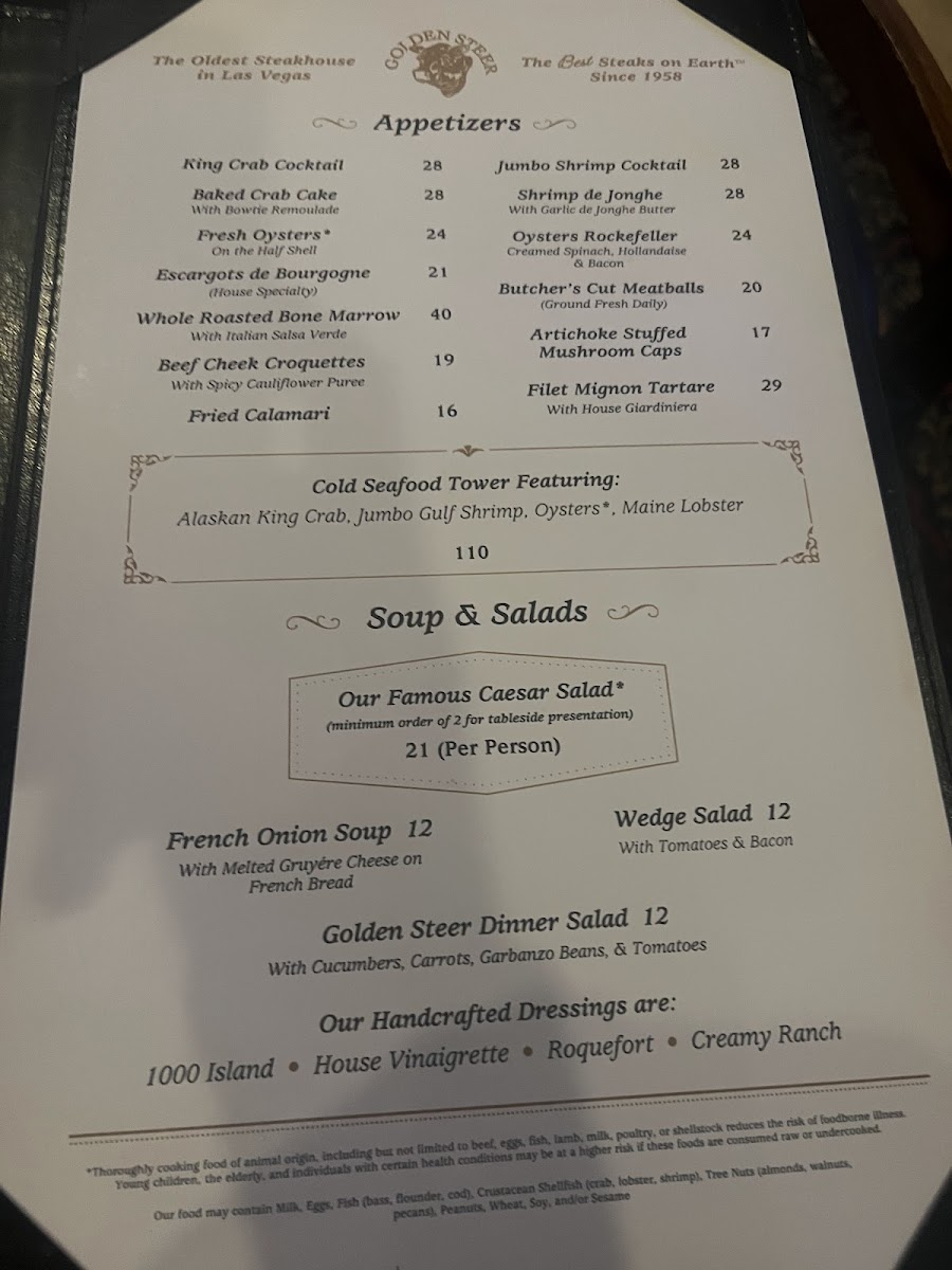 Golden Steer Steakhouse Las Vegas Menu